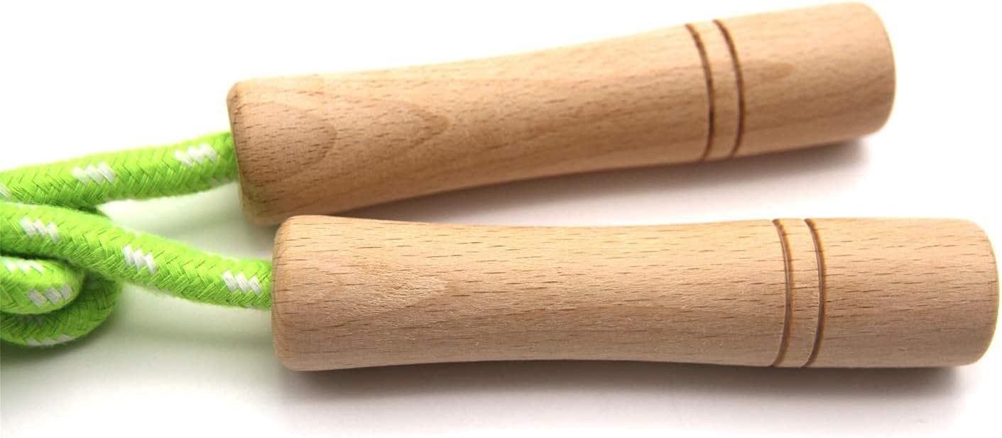 - High-Quality & Safe Design – Crafted with non-toxic, odorless wooden handles, the smooth, 3.9-inch grips are designed to fit comfortably in kids’ hands. The lightweight cotton-braided rope is durable, tangle-free, and gentle—leaving no harsh whip marks.